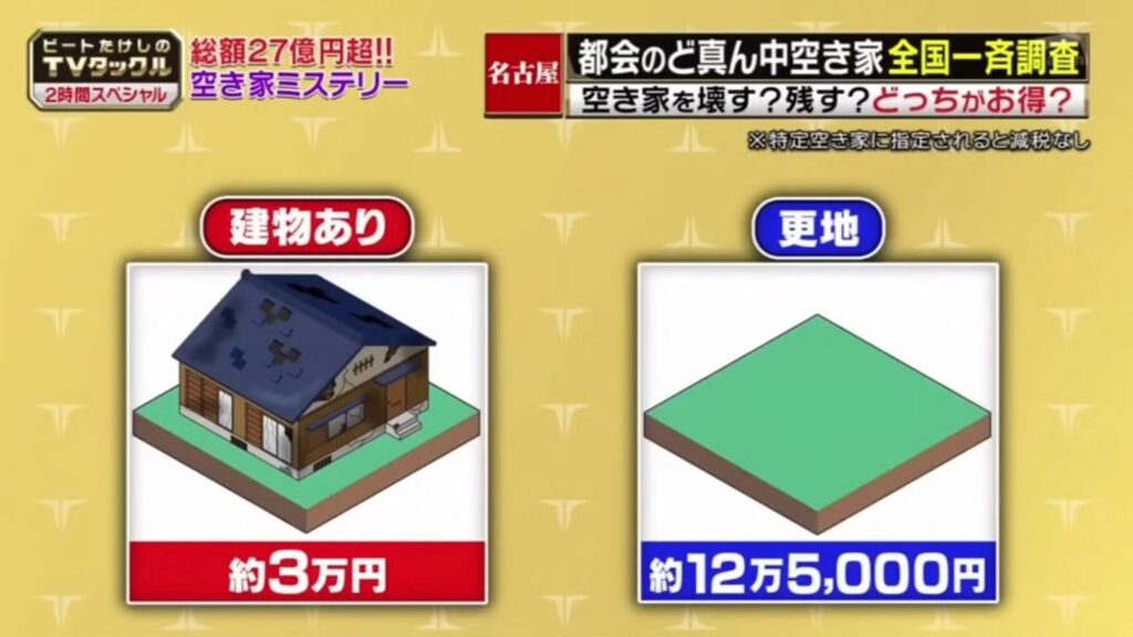 固定資産税だけで見ると「建物有り」の場合「3万円」「更地」にした場合「12万5,000円」… 更地の方が固定資産税が高いという歪な構造もあり、一見、空き家にしておいた方が得な様にも見えます。